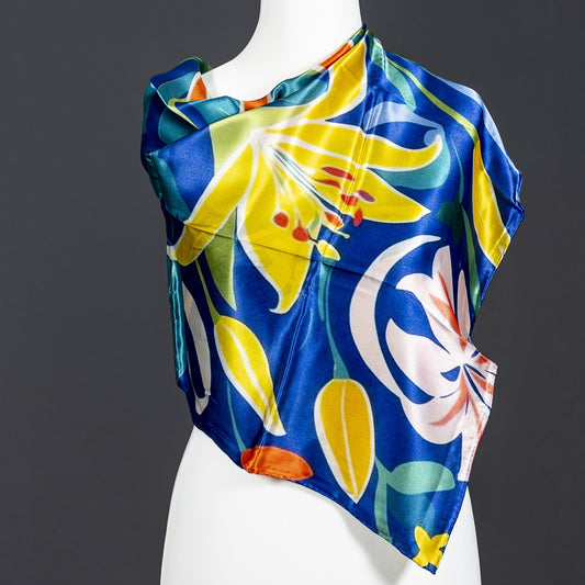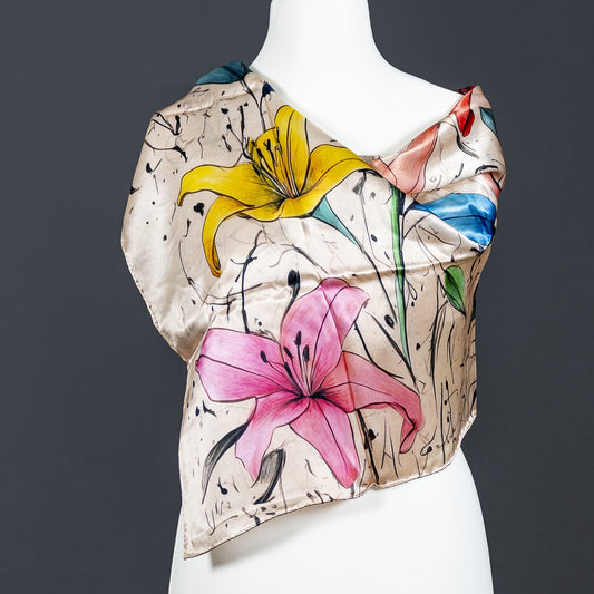 Lebendiges Lilien-Halstuch aus Satin-Seide: Inspiriert von Joan Miró